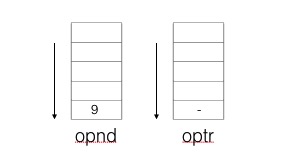 1、读入字符 '9',因为是运算数,则放入 opnd 栈中,剩余待读入字符串为:-2*4+9/3,此时 opnd 栈和 optr 栈如下图所示: