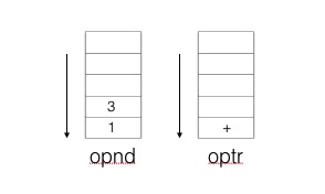 12、optr 栈不为空,则出栈 optr,得到运算符 '+',从 opnd 出栈2次,得到 '1' 和 '3' 分别作为运算符 '+' 的左右操作数进行运算(即1+3),得到结果 '4'并入栈 opnd,此时 opnd 栈和 optr 栈如下图所示: