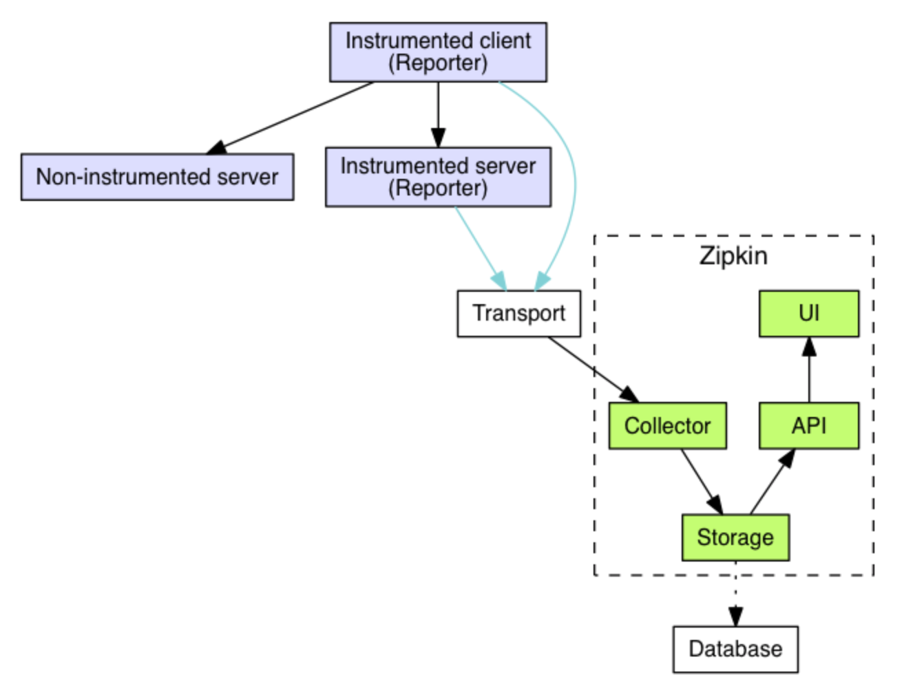 这图是Zipkin的架构图,绿色部分是Zipkin四个核心的组件: Collector,Storage,API,UI;