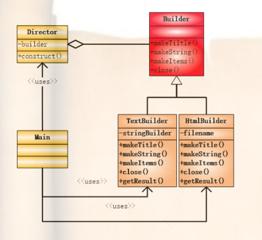 Builder建造者模式和模板模式非常像,但是也有区别,模板模式中父类对子类中的实现进行操作,在父类之中进行一件事情的处理,但是在Builder模式之中,父类和子类都不用关心怎么处理,而是用另一个类来完成对这些方法的有机组合,这个类的职责就是‘监工’,规定了到底要怎么样有机的组合这些方法。在监工类(Director)中,将父类组合进去,然后调用父类的操作来抽象的实现一些事情,这就是面向接口(抽象)的妙处,当然这个Builder可以是接口也可以是抽象类,在这里我们使用抽象类。