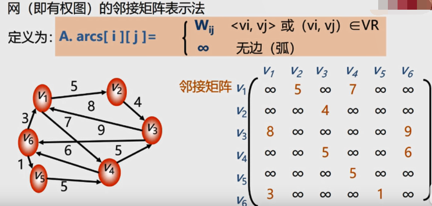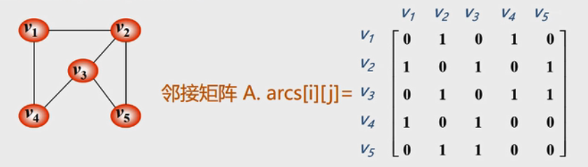 图的邻接矩阵是一个二维数组A.arcs[n][n],定义为: