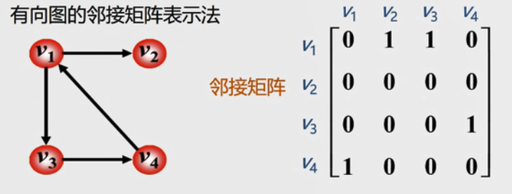在有向图的邻接矩阵中,第i行含义:以结点Vi为尾的弧(即出度边);第i列含义:以结点Vi为头的弧(即入度边)。