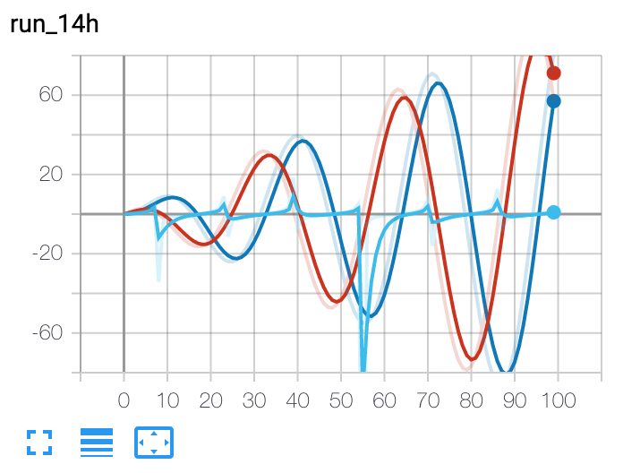 from torch.utils.tensorboard import SummaryWriter writer = SummaryWriter() r = 5 for i in range(100): writer.add_scalars('run_14h', {'xsinx':i*np.sin(i/r), 'xcosx':i*np.cos(i/r), 'tanx': np.tan(i/r)}, i) writer.close()