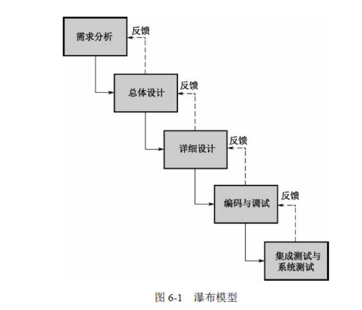 - 可行性研究与计划、需求分析、概要设计、详细设计实现、集成测试、确认测试、使用和维护