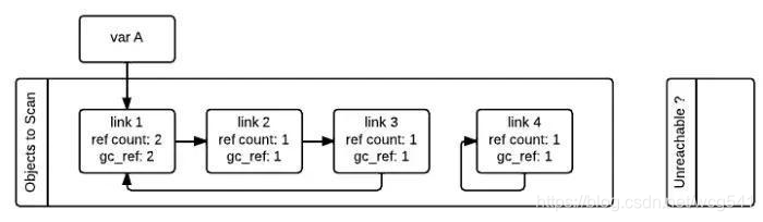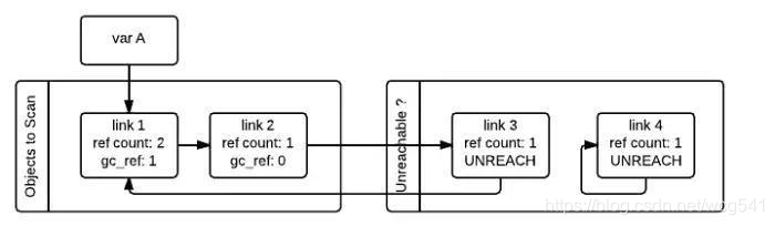 如果对象的gc_ref不为0,那么这个对象就会被标记为GC_REACHABLE。同时当gc发现有一个节点是可达的,那么他会递归式的将从该节点出发可以到达的所有节点标记为GC_REACHABLE,这就是下图中link2和link3所碰到的情形。