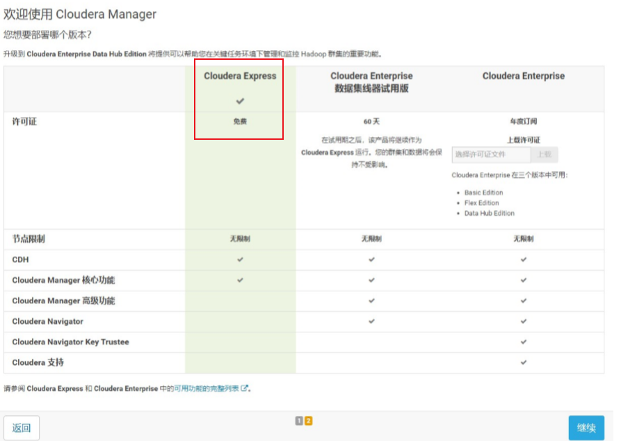 在 main-master:7180 页面中,选择 Cloudera Express 免费版。