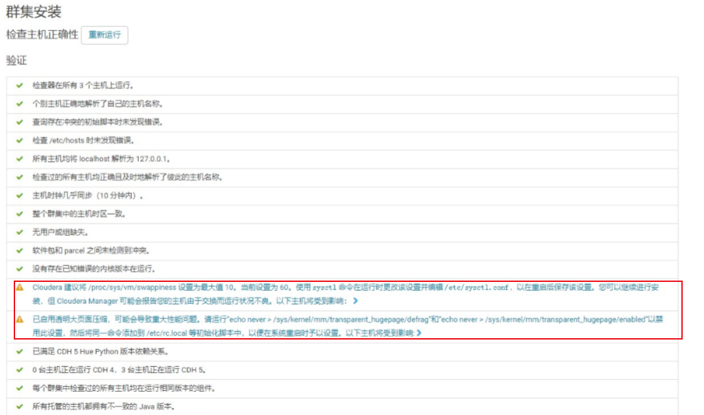 进行主机检查,会显示集群中存在的问题。一一进行解决。