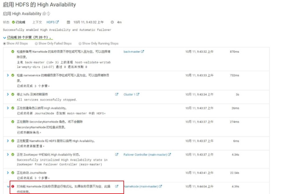 进行ha模式的搭建,会报namenode的格式化失败,由于namenode已经格式化了一次并运行了,所以 会失败,但并没有影响。