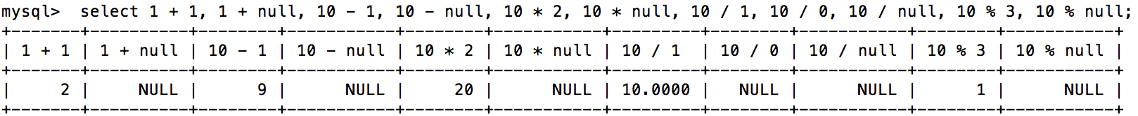 与NULL做运算结果都为NULL,除法和求模计算除数不可以为0,否则返回NULL。