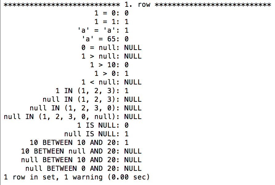 与NULL做运算的时候反悔结果为NULL,同时NULL在做IN运算的时候也会返回NULL,使用 字符 与 数字进行比较的时候 返回结果 0 但是会触发一个warnning;