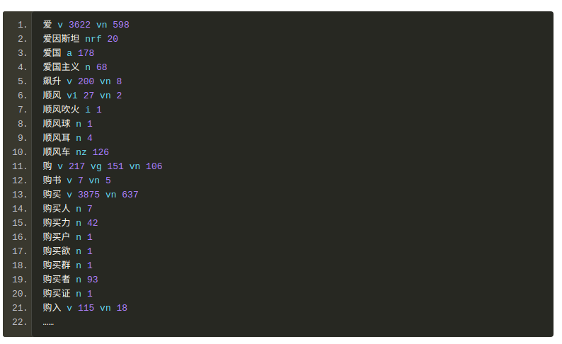 - 每一行代表一个单词,格式遵从[单词] [词性A] [A的频次] [词性B] [B的频次] ...。