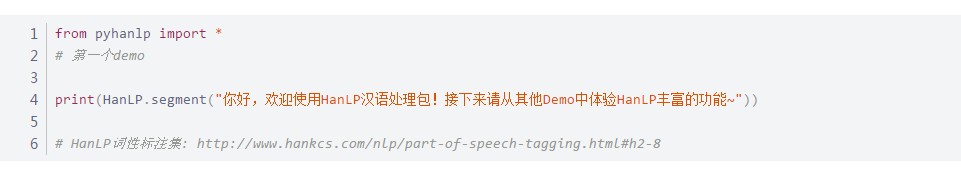 1.HanLP中有一系列“开箱即用”的静态分词器,以Tokenizer结尾,在接下来的例子中会继续介绍。