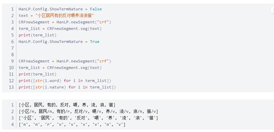 方法也很简单。使用HanLP.Config.ShowTermNature = False修改配置,使其不显示词性即可。