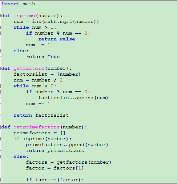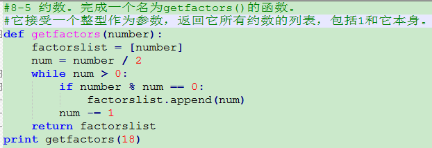 8-6素因子分解。以刚才练习中的inprime()和getfactors()函数为基础编写一个函数,它接受一个整型作为参数,返回该整型所有素数因子的列表。这个过程叫做素因子分解,它输出的所有因子之积应该是原来的数字。注意列表里可能有重复的元素。例如输入20返回结果应该是[2,2,5]。
