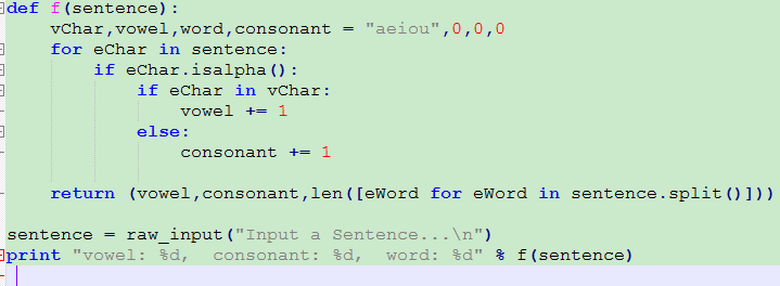8-10 文本处理。统计一句话中的元音,辅音及单词(以空格分隔)的个数。忽略元音和辅音的特殊情况,如‘h’,‘y’,‘qu’等。附加题:编写处理这些特殊情况的代码。