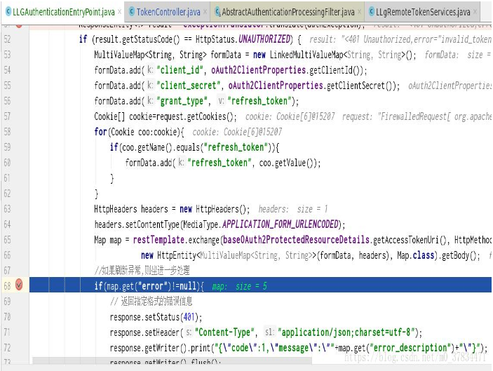 - 使用失效的token访问资源的时候,可以发现断点直接到达异常处理器,由此看出token确实是失效的并且进入了异常处理器进行处理,最终通过refresh_token获取到最新的token再次成功访问获取资源