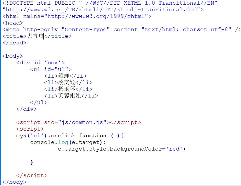 从代码中可以看到我们给‘li’,‘办了一个换背景颜色的事情’ ,但事情委托给了它的父节点‘ul'办事(onclick)