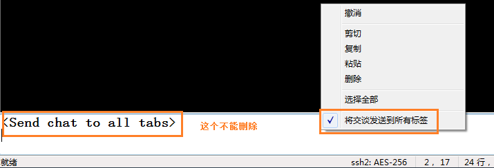 打开SecureCRT软件工具后,菜单栏查看选项勾选 “交谈窗口”,然后下面出现一个空白框。在空白框里右键选中“将交谈发送到所有标签”,如下图: