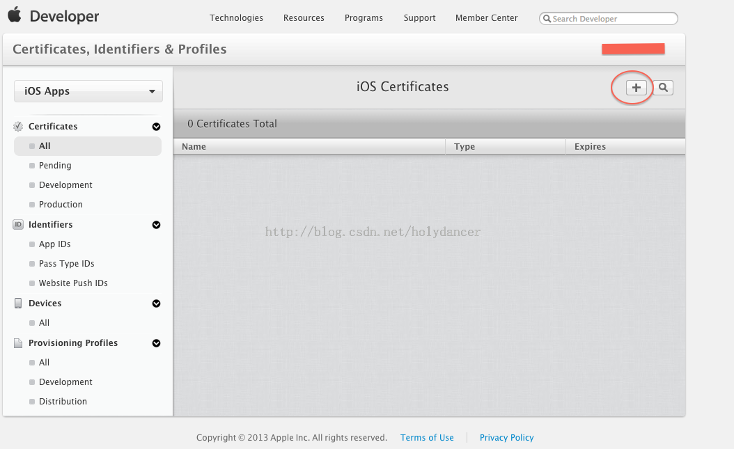 1、开发者证书的制作,首先登陆到开发者中心,找到证书配置的版块,点进证书,会显示如下界面,点击右上角的加号