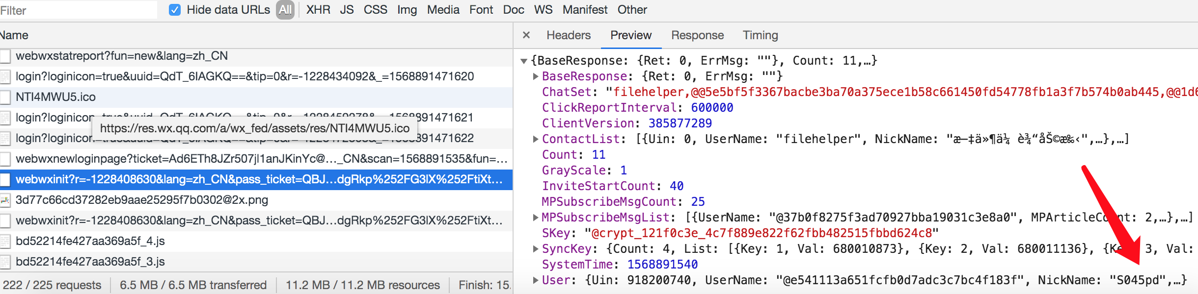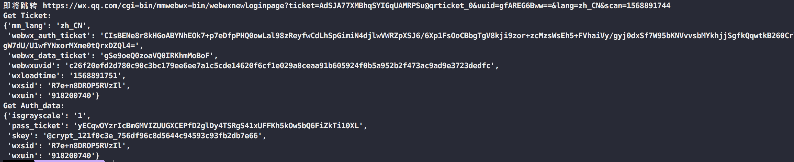 def get_auth_data(resp): return { key: resp.html.find(key)[0].text for key in ["skey", "wxsid", "wxuin", "pass_ticket", "isgrayscale"] } def get_ticket(): resp = session.get( redirect_uri, params={"fun": "new", "lang": "zh_CN", "_": get_timestamp()} ) print("Get Ticket:", requests_html.requests.utils.dict_from_cookiejar(resp.cookies)) auth_data = get_auth_data(resp) session.cookies.update( requests_html.requests.utils.cookiejar_from_dict( {"last_wxuin": auth_data["wxuin"]} ) ) if list(filter(lambda item: item[1], auth_data.items())): return auth_data auth_data = get_ticket() 现在,我们也成功得取得了票据信息。此处的信息将帮助我们得以成功获取个人实况信息。