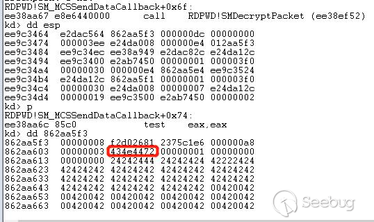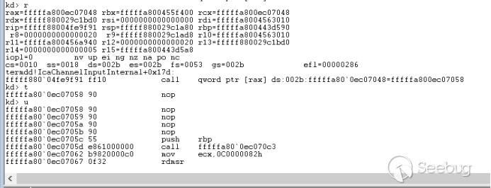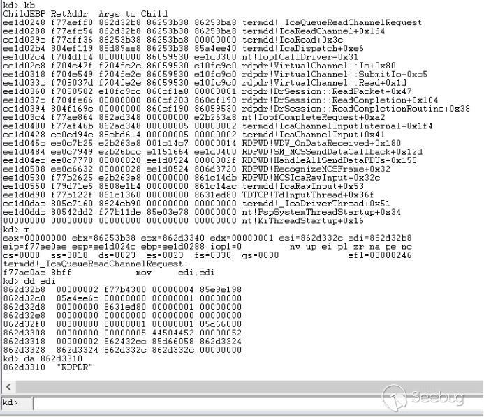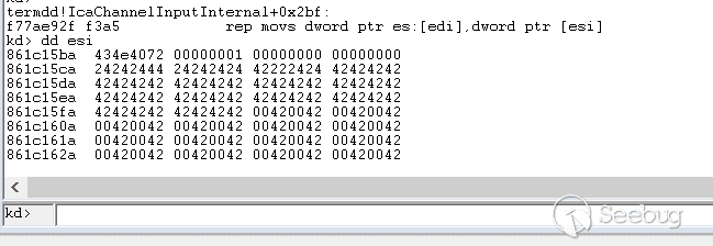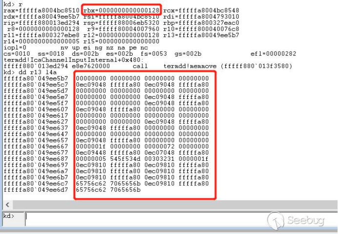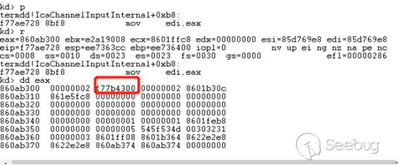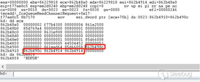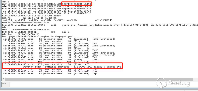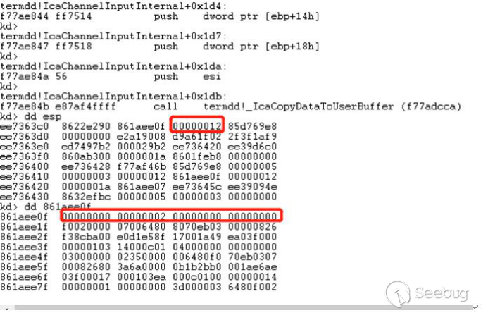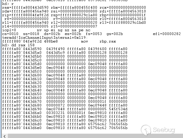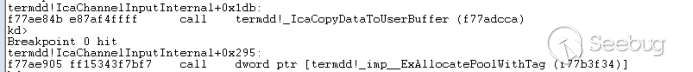 经过函数termdd! _IcaQueueReadChannelRequest对此标志的处理后变成如下,所以下一个数据依然会进入termdd!_IcaCopyDataToUserBuffer,导致我们进行池喷射的失败