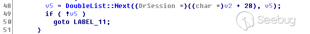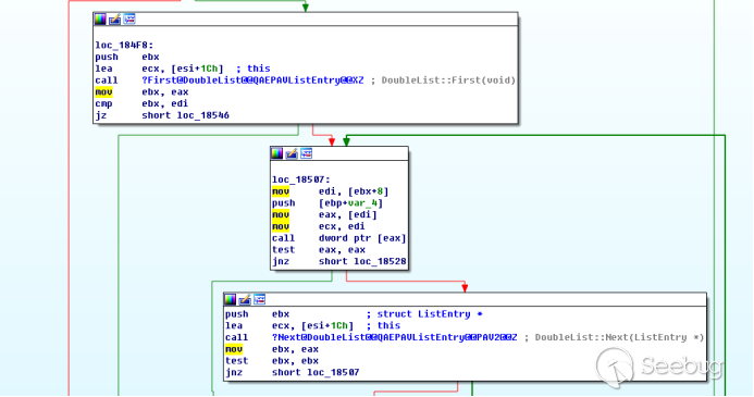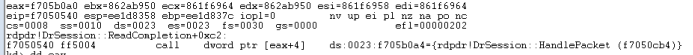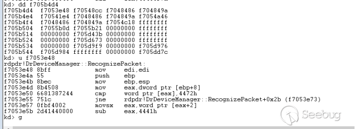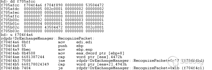 最后两个函数数组依次调用rdpdr!DrExchangeManager::RecognizePacket和rdpdr!DrDeviceManager::RecognizePacket,都会判断错误的头部标志0x7240,最后导致链表遍历完后进行错误跳转,直接绕过了termdd! _IcaQueueReadChannelRequest对标志位的修改,将会打破循环