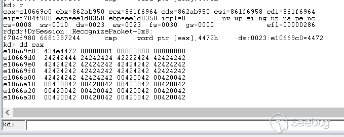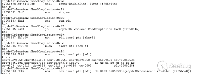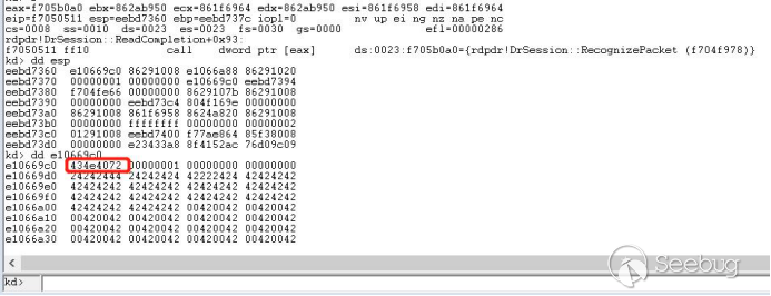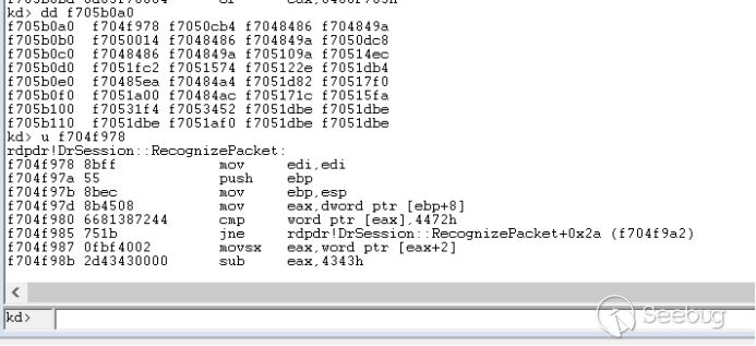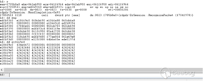 我们构造一个头部异常的数据包发送,头部标志我们构造的是0x7240,将会导致rdpdr!DrSession::RecognizePacket判断失败,之后将会继续遍历链表依次再取出两张函数数组