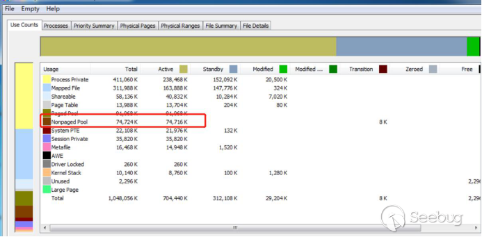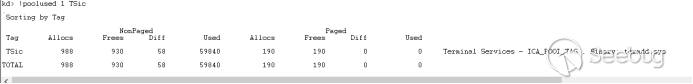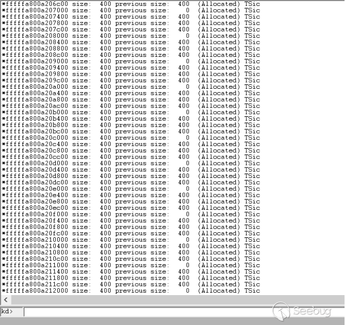 之后开始池喷射,将payload喷射到可以call [rax] == 0xfffffa80ec000948的地方,喷射的payload大小基本是0x400,总共喷射了200mb的数据大小,我们先来看下喷射前带标志TSic总共占用池内存大小是58kib左右
