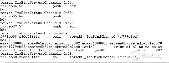 在rdp内核中依次注册的值对应应该是0、1、2、3, MS_T120信道将会通过我们发送的用户虚拟id为3的值再一次绑定,首先通过termdd!_IcaFindVcBind找到了刚开始注册的虚拟通道id是0x1f,如下所示: