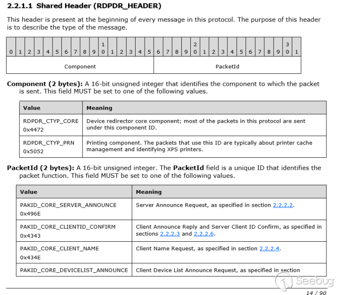 0x01 通过RDPDR信道进行数据占位 我们先来了解下rdpdr信道,首先rdpdr信道是文件系统虚拟通道扩展,该扩展在名为rdpdr的静态虚拟通道上运行。目的是将访问从服务器重定向到客户端文件系统,其数据头部将会主要是两种标识和PacketId字段组成: