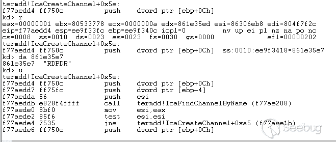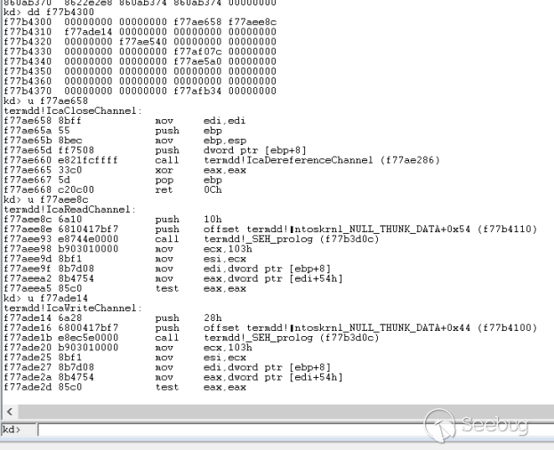 在这个函数指针数组中主要存放了三个函数,其中对应了termdd!IcaCloseChannel、termdd!IcaReadChannel、termdd!IcaWriteChannel