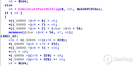 最后我们连续构造多个错误的数据包后将会进入ExAllocatePoolWithTag,分配到我们需要的非分页内存!