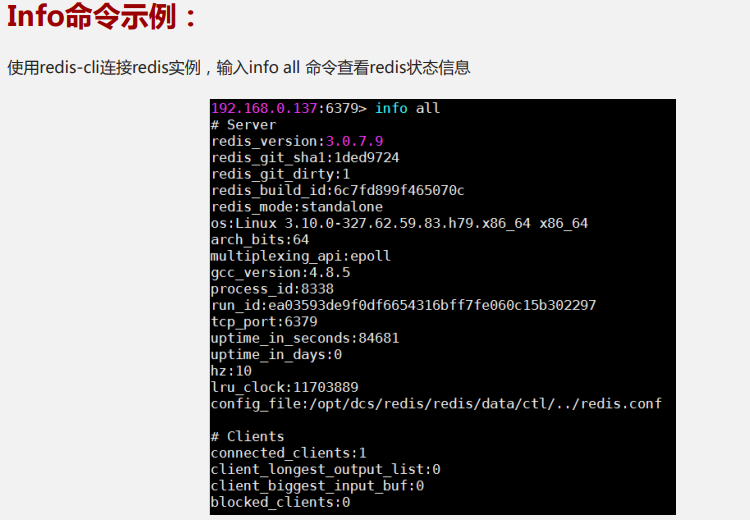 Info是Redis提供的一个非常有用的查看状态信息的命令。使用 redis-cli 连上 Redis,输入 info all 命令,redis-server 就 会返回 Redis 的状态信息,详细内容如下: