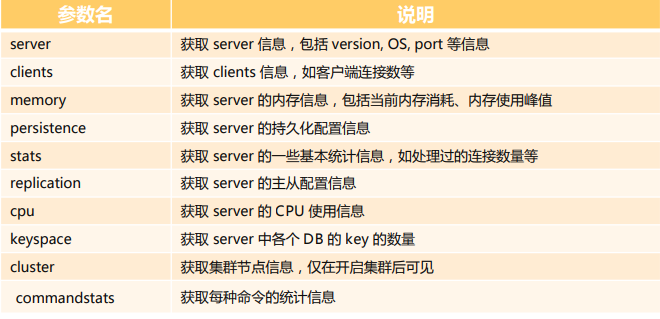 Persistence 和replication :与数据库持久化和主备复制有关,cpu 反映了 Redis 服务器 CPU 使用信息, commandstas 是显示 Redis 所有命令执行的详细信息,包括命令调用次数、命令消耗的CPU 时间总量、 每次执行命令消耗 CPU 时间的平均值