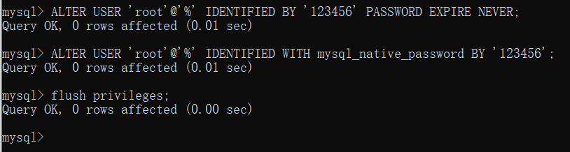 3.ALTER USER 'root'@'%' IDENTIFIED BY '123456' PASSWORD EXPIRE NEVER;