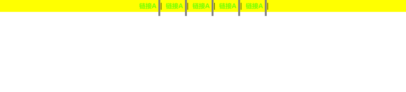 <html><head><meta charset="UTF-8"> <title >Css学习</title> <!-- 此处的style.试试已无作用--> <link rel="stylesheet" href="style.css" /><style> *{ margin: 0; padding: 0; } #menu{ min-width: 400px; height:2rem; background: yellow; text-align: center; line-height: 2rem; font-size: 1rem; } #menu a{ padding: 1rem; color: chartreuse; text-decoration: none; font-weight: bold; /*以下为标签线属性设置*/ padding-right:5px; padding-left:5px; border-right:5px solid gray; } #menu a:hover{color: blue}</style></head><body ><div id="menu"> <a href="#">链接A</a>|<!--这根线注意!!,用标签处理器处理过--> <a href="#">链接A</a>| <a href="#">链接A</a>| <a href="#">链接A</a>| <a href="#">链接A</a>|</div></body></html>