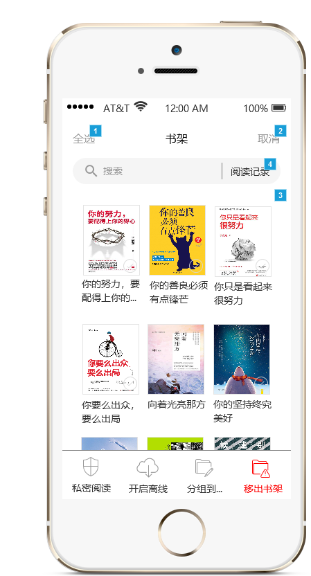 点击“编辑”链接后即可对书架图书进行状态修改(私密阅读、开启离线、分组到...、移出书架)操作,仅仅实现了对书籍的单选,其他功能还有待完善Ծ‸Ծ,如下图所示: