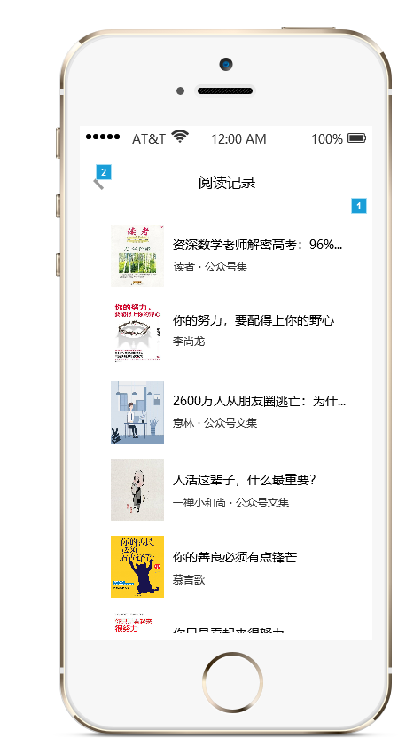 点击“阅读记录”链接后跳转页面到阅读记录列表,实现了使用鼠标模拟用户对APP页面进行上下滑动的操作,如下图所示: