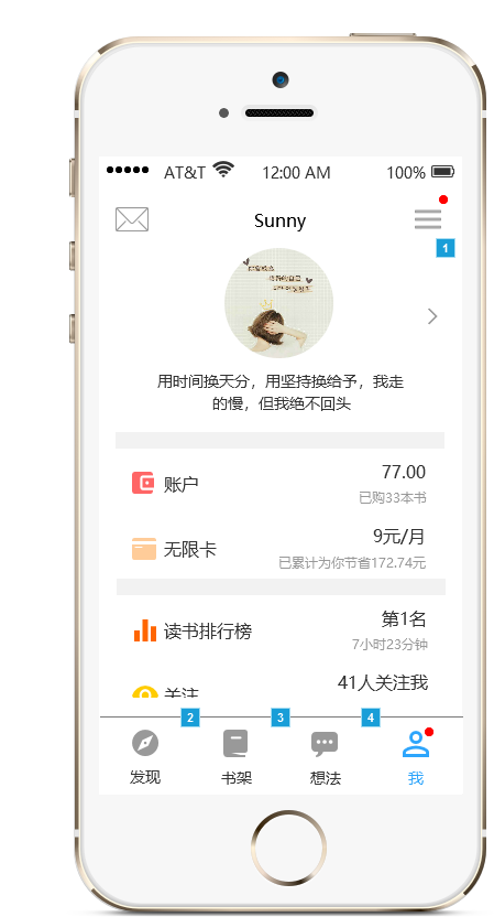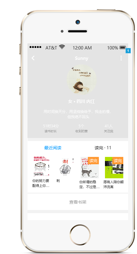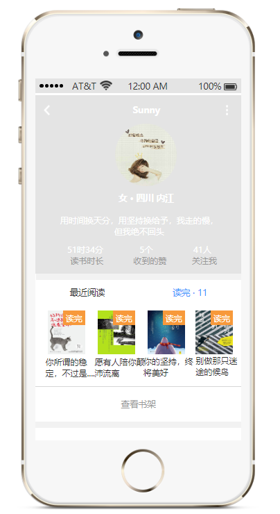 点击个人中心头像部分即可跳转到个人详细信息,实现了“最近阅读”和“读完·11”的tab切换,如下图所示: