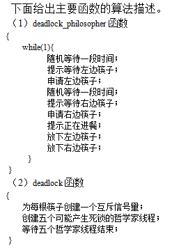 死锁是进程并发执行过程中可能出现的现象,哲学家就餐问题是描述死锁的经典例子。假设有几位哲学家围坐在一张餐桌旁,桌上有吃不尽的食品,每两位哲学家之间摆放着一根筷子,筷子的个数与哲学家的数量相等,每一位哲学家要么思考,要么等待,要么拿起左右两根筷子进餐。本设计假设有五个哲学家和五根筷子,它们的编号都是从0到4。 如果每位哲学家都拿起左边的筷子,就会发生死锁。