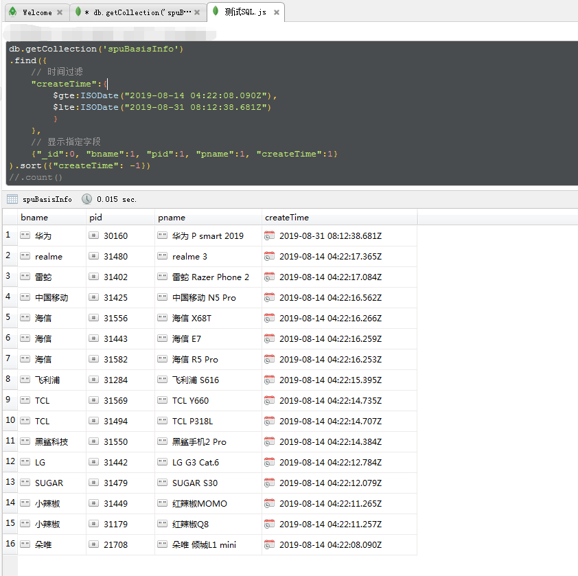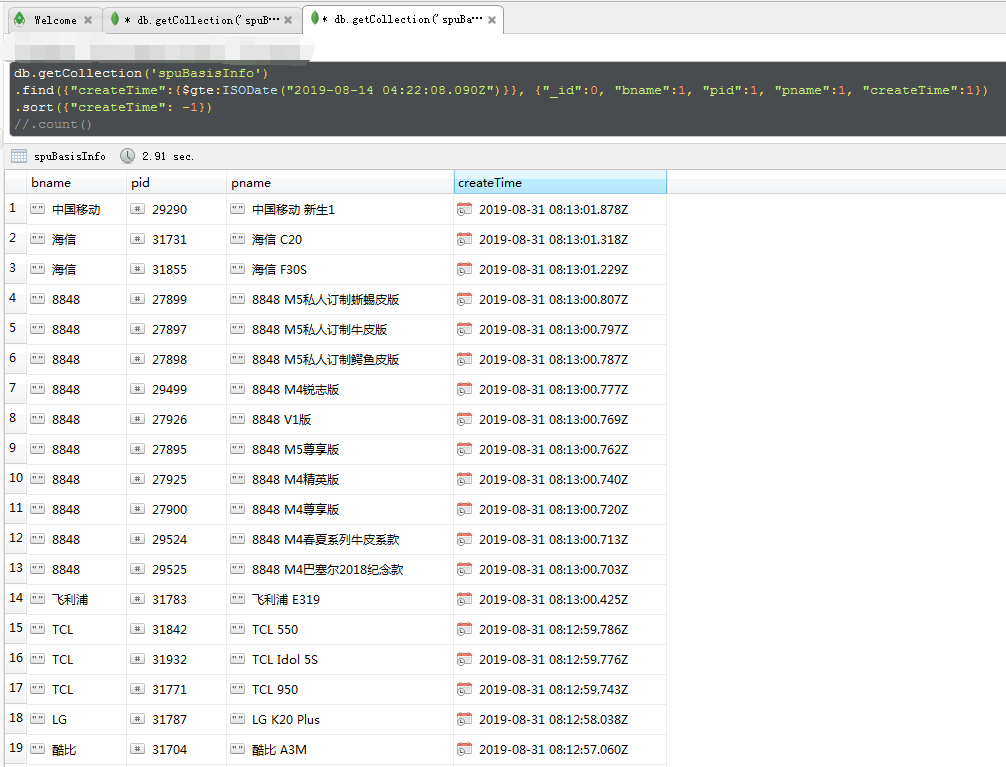 .find({"createTime":{$gte:ISODate("2019-08-14 04:22:08.090Z")}}, {"_id":0, "bname":1, "pid":1, "pname":1, "createTime":1})