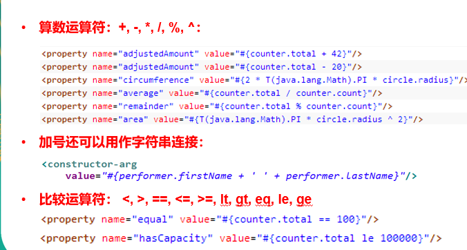 7.SpringEL表达式(了解):可用来赋值、引用bean对象(通过id)、引用属性、引用方法、引用静态方法、计算表达式的值、 使用正则表达式。