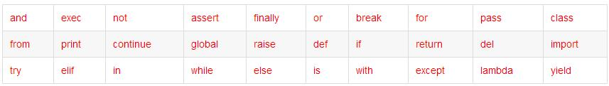 下面的列表显示了在Python中的保留字。这些保留字不能用作常数或变数,或任何其他标识符名称。