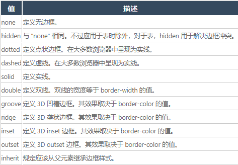 border-style 属性用于设置元素所有边框的样式,或者单独地为各边设置边框样式。只有当这个值不是 none 时边框才可能出现。