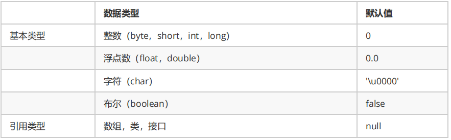 - 如果成员变量没有进行赋值,那么将会有一个默认值,规则和数组一样。