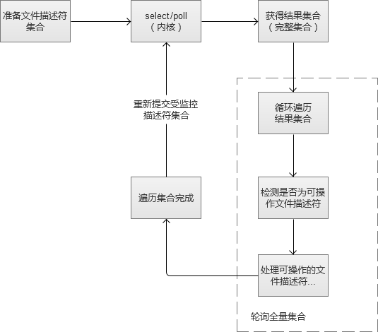 select/poll返回的是一个我们之前提交的文件描述符集合(内核将其中可读、可写或者异常状态的socket文件描述符的标识位修改了),我们需要通过轮询检查才能获得我们可以操作的文件描述符。在这个过程中,不断重复执行。在实际应用场景中,大部分被我们监控的socket文件描述符,都是”空闲的“,也就是说,不能操作。我们对整个集合轮询,就是为了找了少部分我们可以操作的socket文件描述符。于是,当我们监控的socket文件描述符越多(用户并发连接数越来越多),这个轮询工作,也就越来越沉重,进而导致增大了CPU的开销。