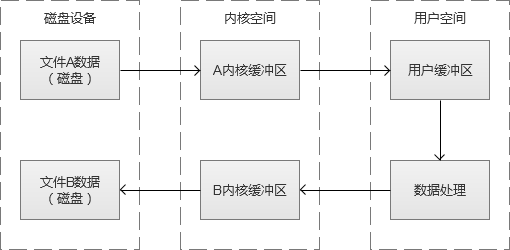 以最简单的磁盘读写例子,从磁盘中读取A文件,写入到B文件。A文件数据是从磁盘开始,然后载入到“内核缓冲区”,然后再拷贝到“用户缓冲区”,我们才可以对数据进行处理。写入的时候,也同理,从“用户态缓冲区”载入到“内核缓冲区”,最后写入到磁盘B文件。