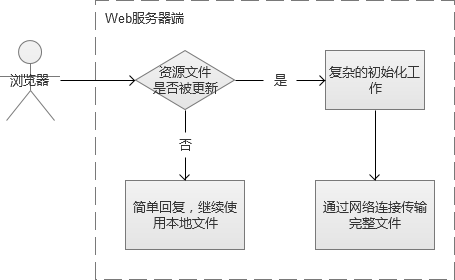 (2)服务器的文件或者内容已经更新,浏览器请求Web资源,Web服务器通过网络传输新的资源内容。(发生通信,Web服务器需要完成复杂的传输工作)