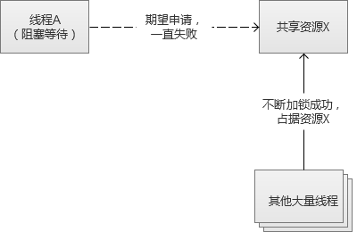 饿死现象(某个线程,一直获取不到它想要锁资源,永远无法执行下一步):